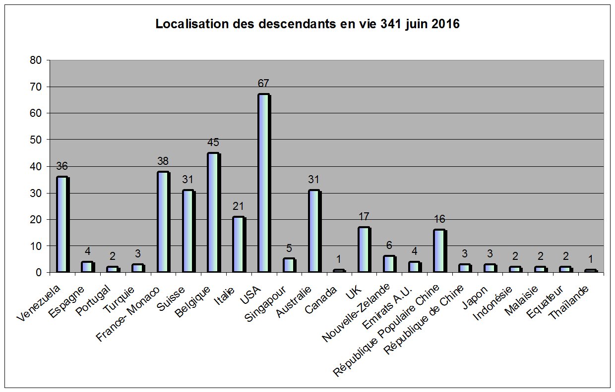 Ajoutons qu'il s'agit ici d'approximations car on ne connait pas toujours exactement à quel endroit les descendants vivent actuellement et parfois, on ne sait pas s'ils sont morts ou vivants.