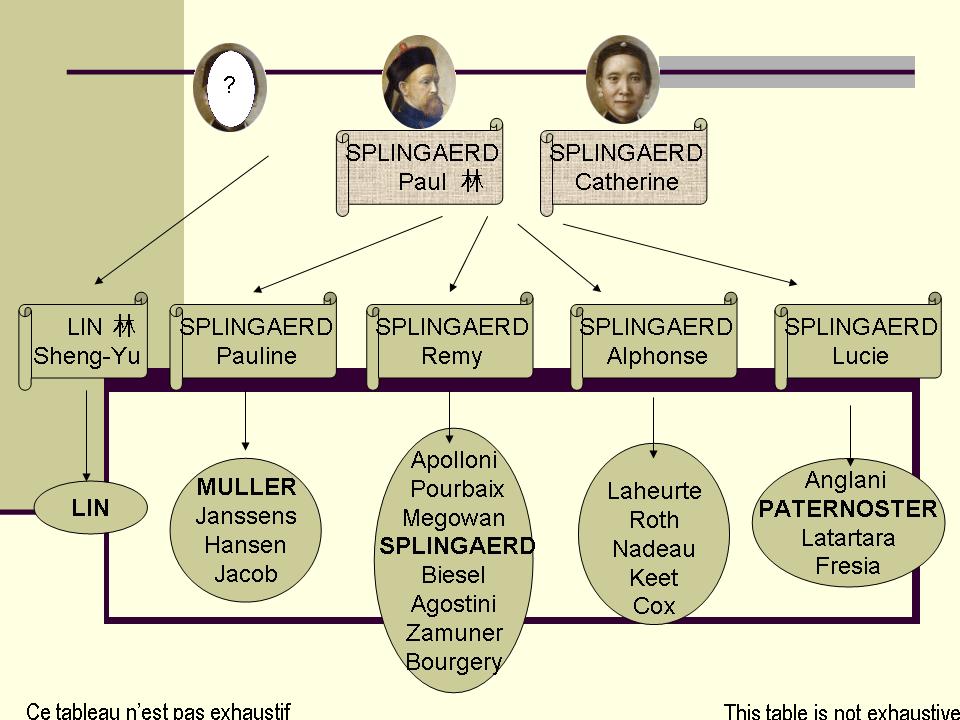 From Paul and Catherine Splingaerd, who had 13 children, only 4 of them gave offspring. Recognitions of paternity and adoptions are treated. Following adoption of fact or law, there were at least two children carrying the Chinese name (Lin).